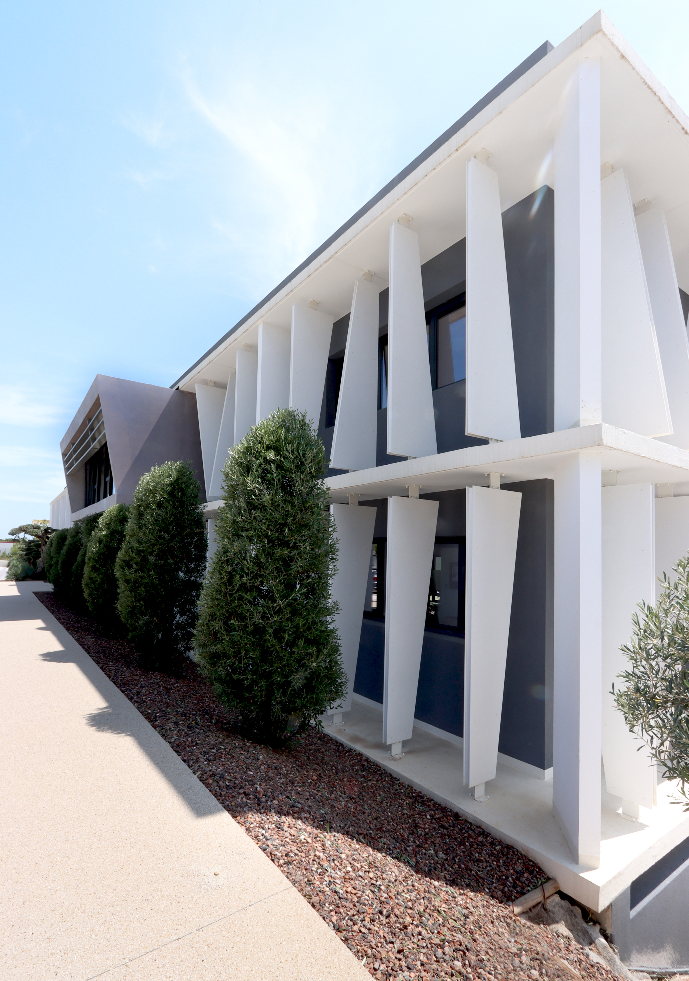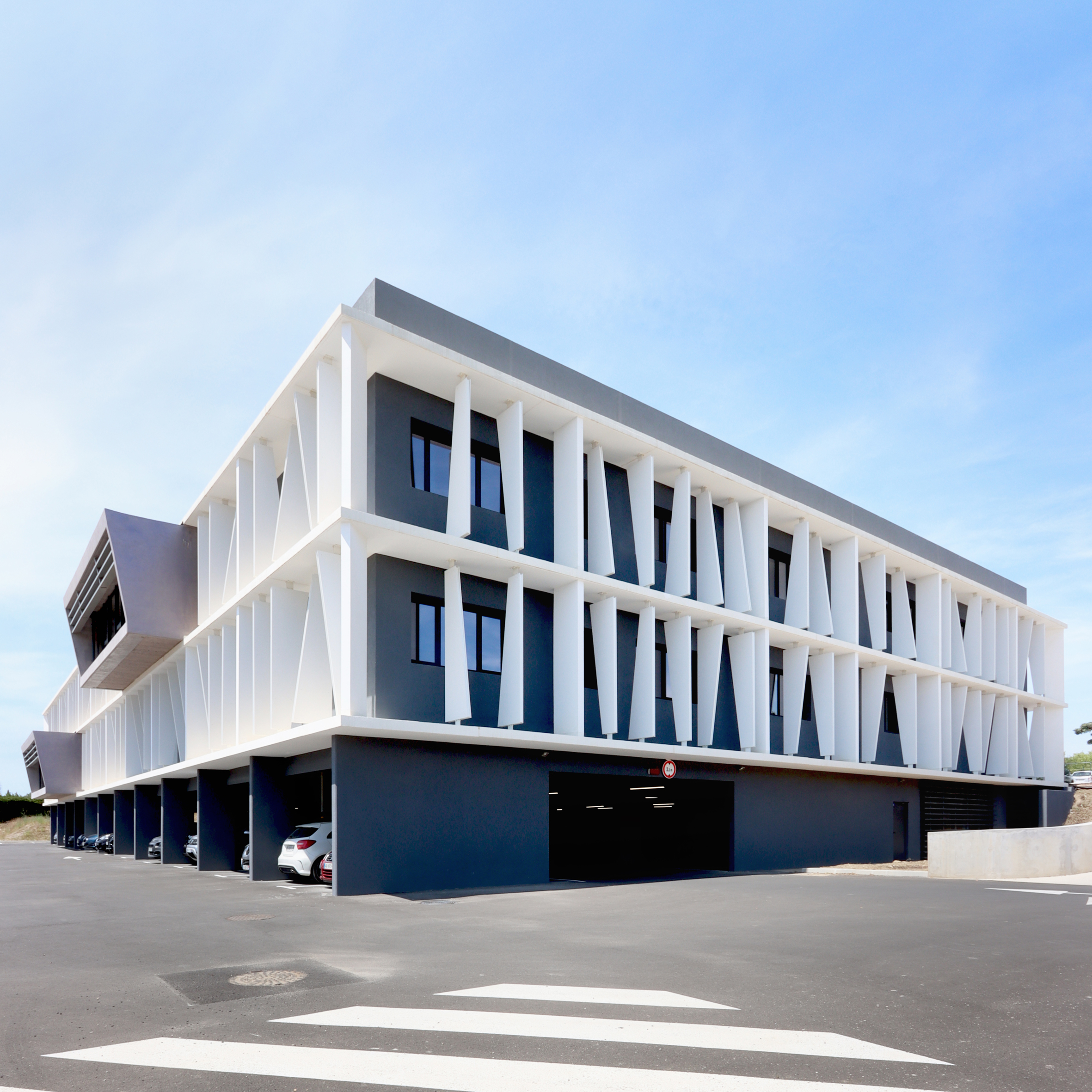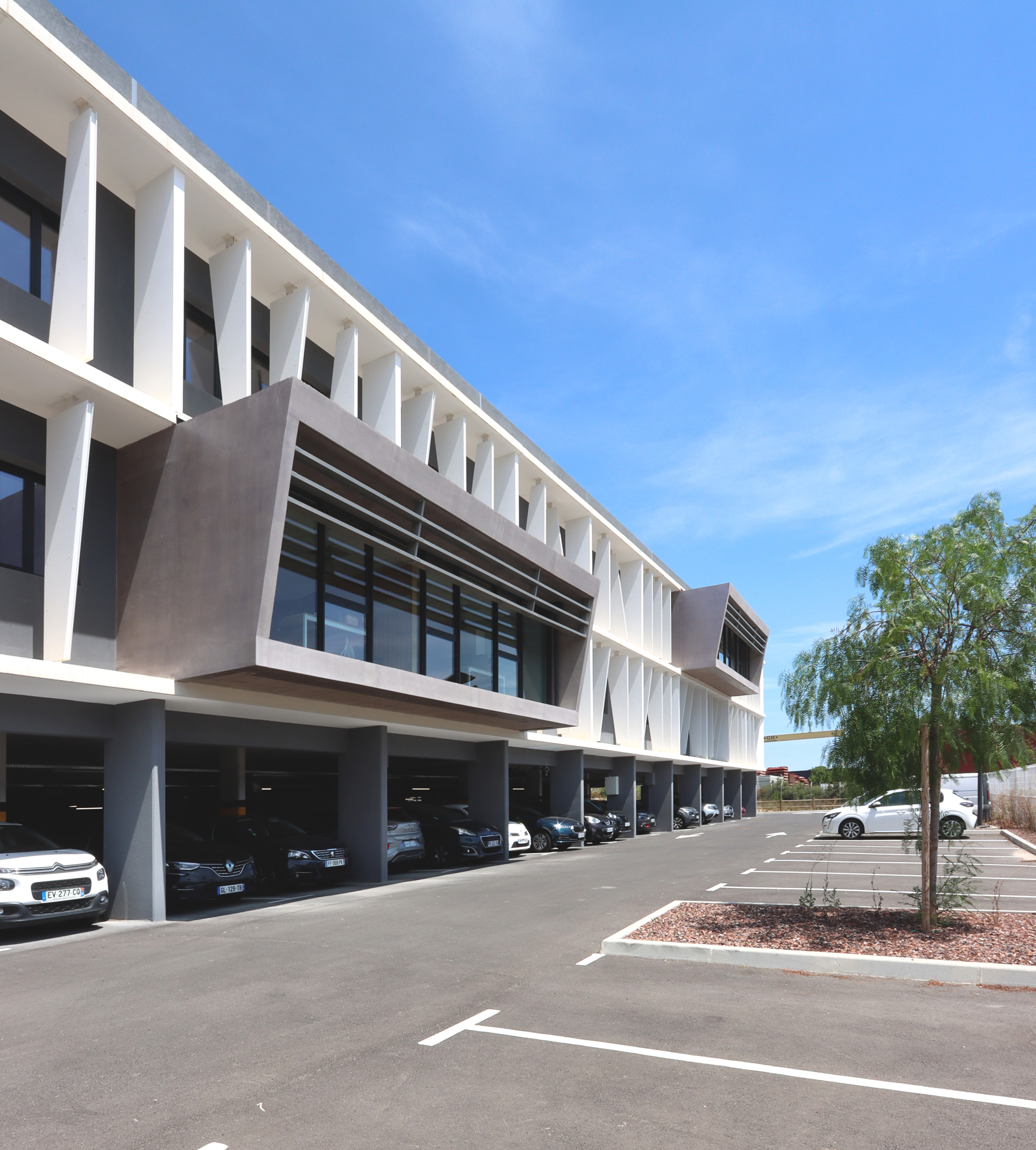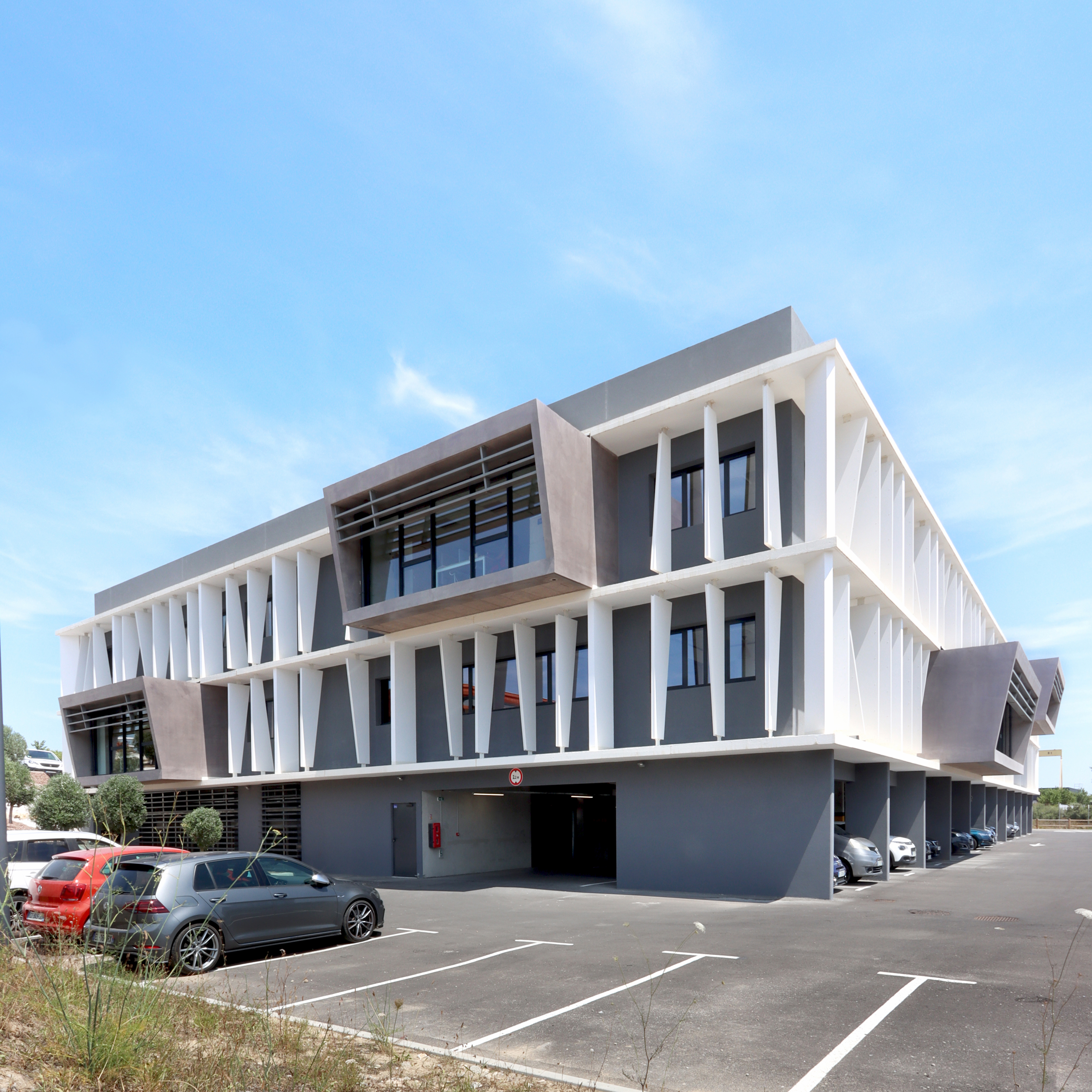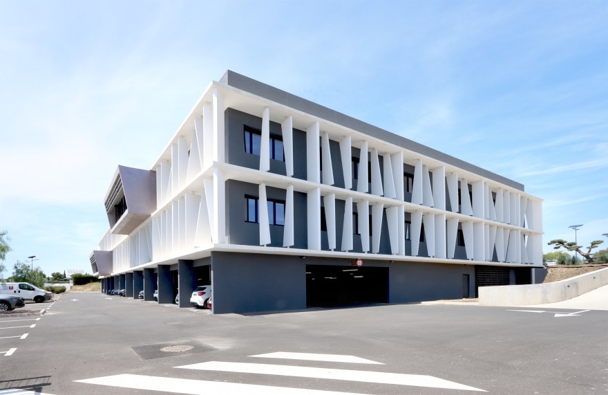 DESCRIPTION : Opération de création d’un immeuble de bureau entièrement en Flex office sur un site existant à la topographie prononcée. Utilisation du dénivelé pour la création d’un parc de stationnement semi enterré et y intégrer l’ensemble des équipements techniques. Volonté architecturale de travailler sur des strates matérialisées par les nez de planchers saillants et des volumes en porte à faux biseautés. Entre ces strates viennent se loger des protections solaires verticales qui trament le bâtiment. Ces brise-soleils verticaux ont une géométrie asymétrique et leur enchaînement anime la façade en suggérant un mouvement. La construction de ces brise-soleils est rationnalisée par l’utilisation d’un seul modèle géométrique, il est simplement retourné par rapport à ses axes pour proposer une variation dynamique afin de limiter l’utilisation de la matière. Deux Patios éclairent généreusement les espaces de travail. Ce sont des espaces extérieurs de détente. Traitement des aménagement extérieurs existants et création d’espaces de convivialité paysagés.