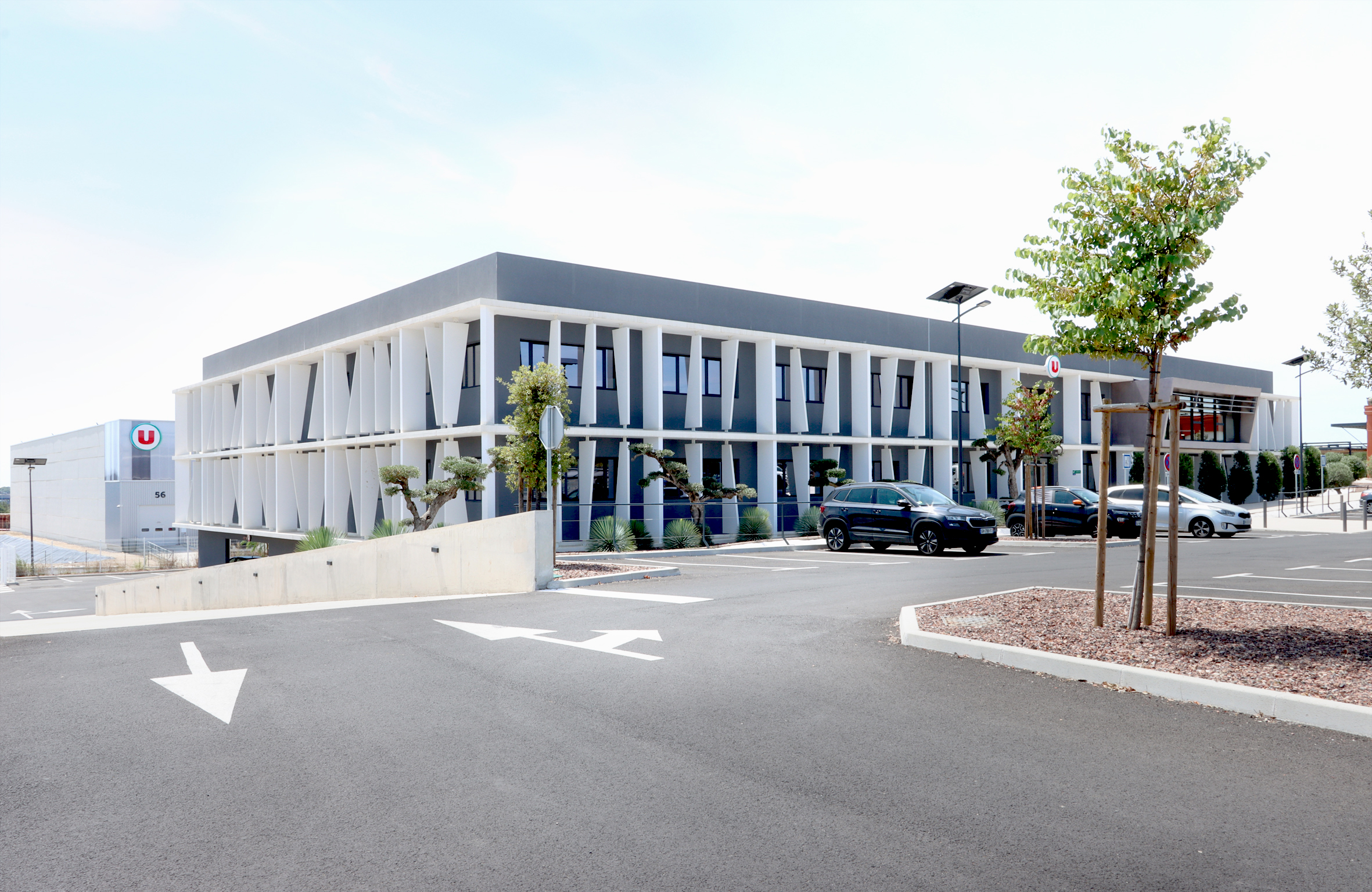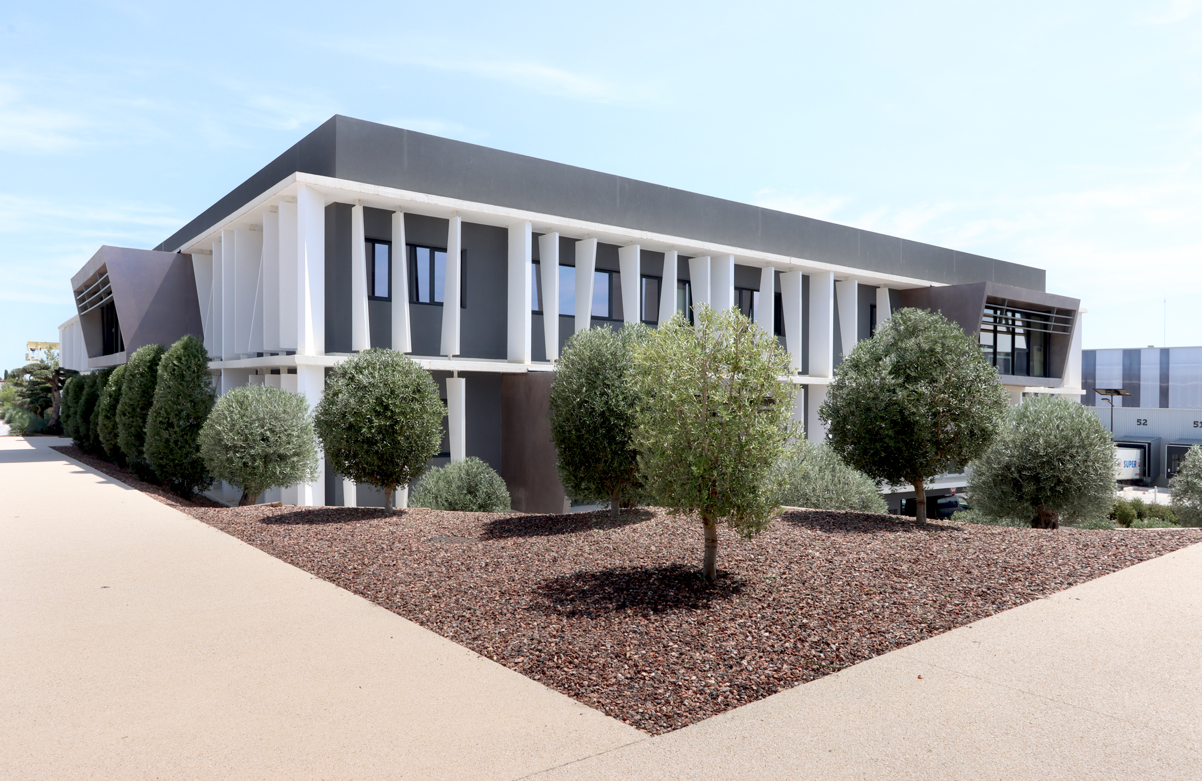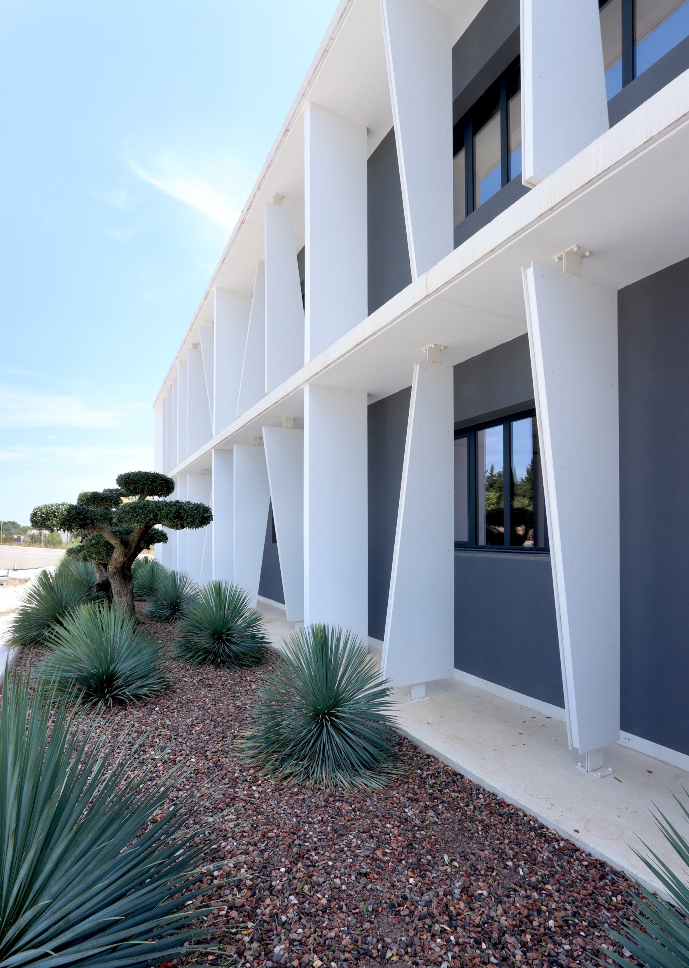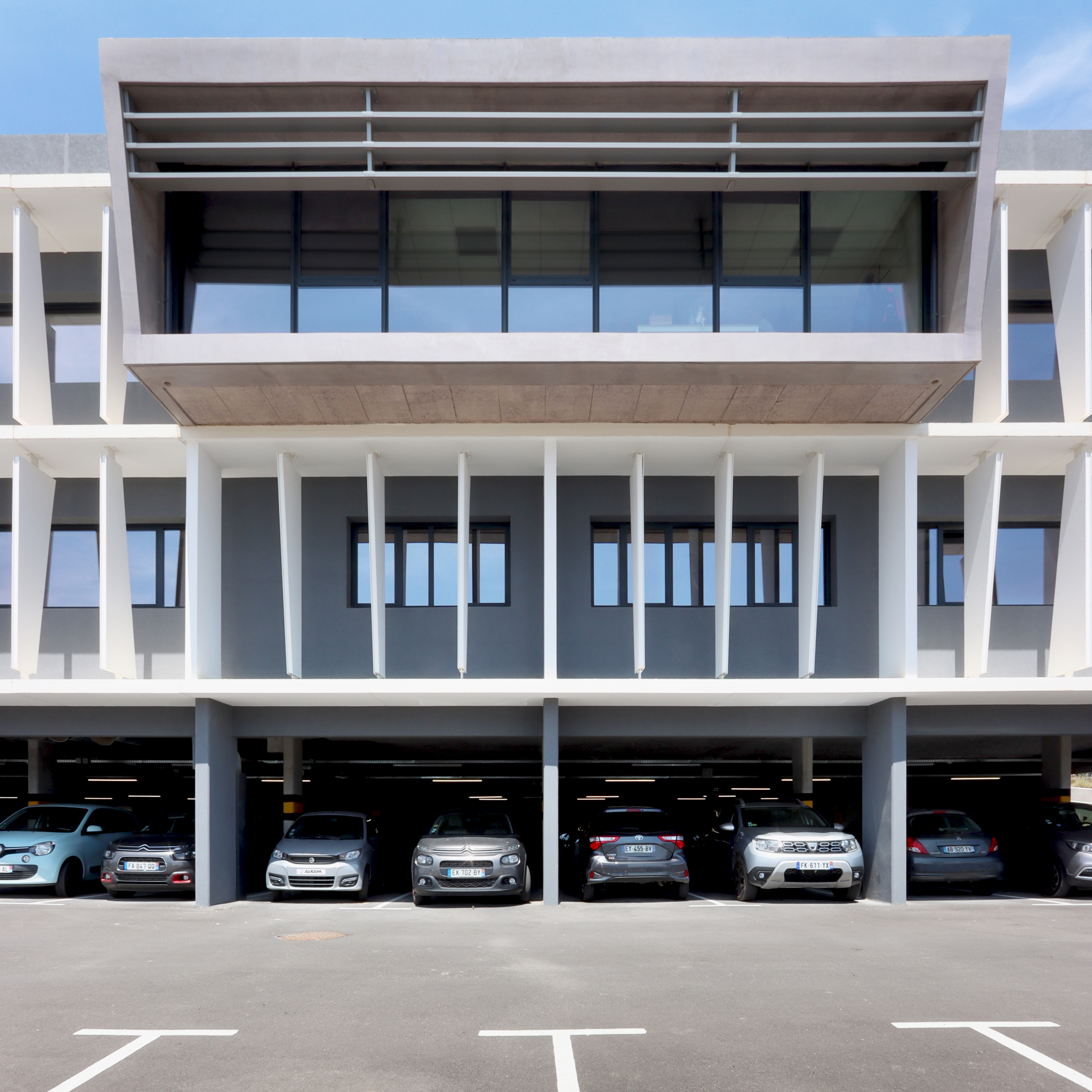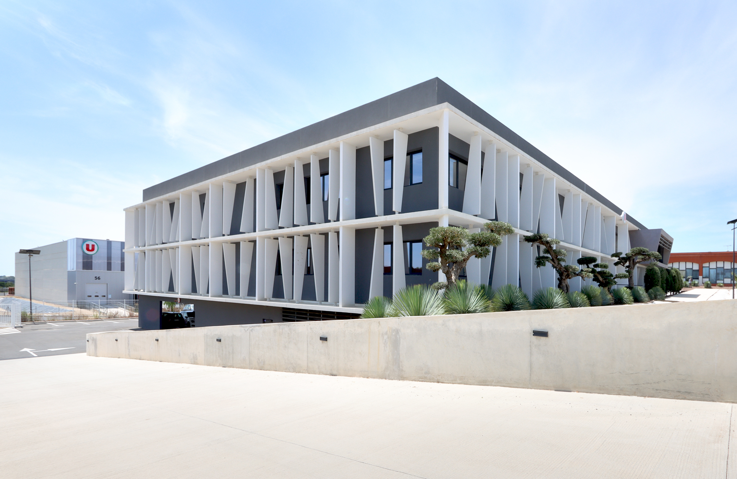 DESCRIPTION : Opération de création d’un immeuble de bureau entièrement en Flex office sur un site existant à la topographie prononcée. Utilisation du dénivelé pour la création d’un parc de stationnement semi enterré et y intégrer l’ensemble des équipements techniques. Volonté architecturale de travailler sur des strates matérialisées par les nez de planchers saillants et des volumes en porte à faux biseautés. Entre ces strates viennent se loger des protections solaires verticales qui trament le bâtiment. Ces brise-soleils verticaux ont une géométrie asymétrique et leur enchaînement anime la façade en suggérant un mouvement. La construction de ces brise-soleils est rationnalisée par l’utilisation d’un seul modèle géométrique, il est simplement retourné par rapport à ses axes pour proposer une variation dynamique afin de limiter l’utilisation de la matière. Deux Patios éclairent généreusement les espaces de travail. Ce sont des espaces extérieurs de détente. Traitement des aménagement extérieurs existants et création d’espaces de convivialité paysagés.