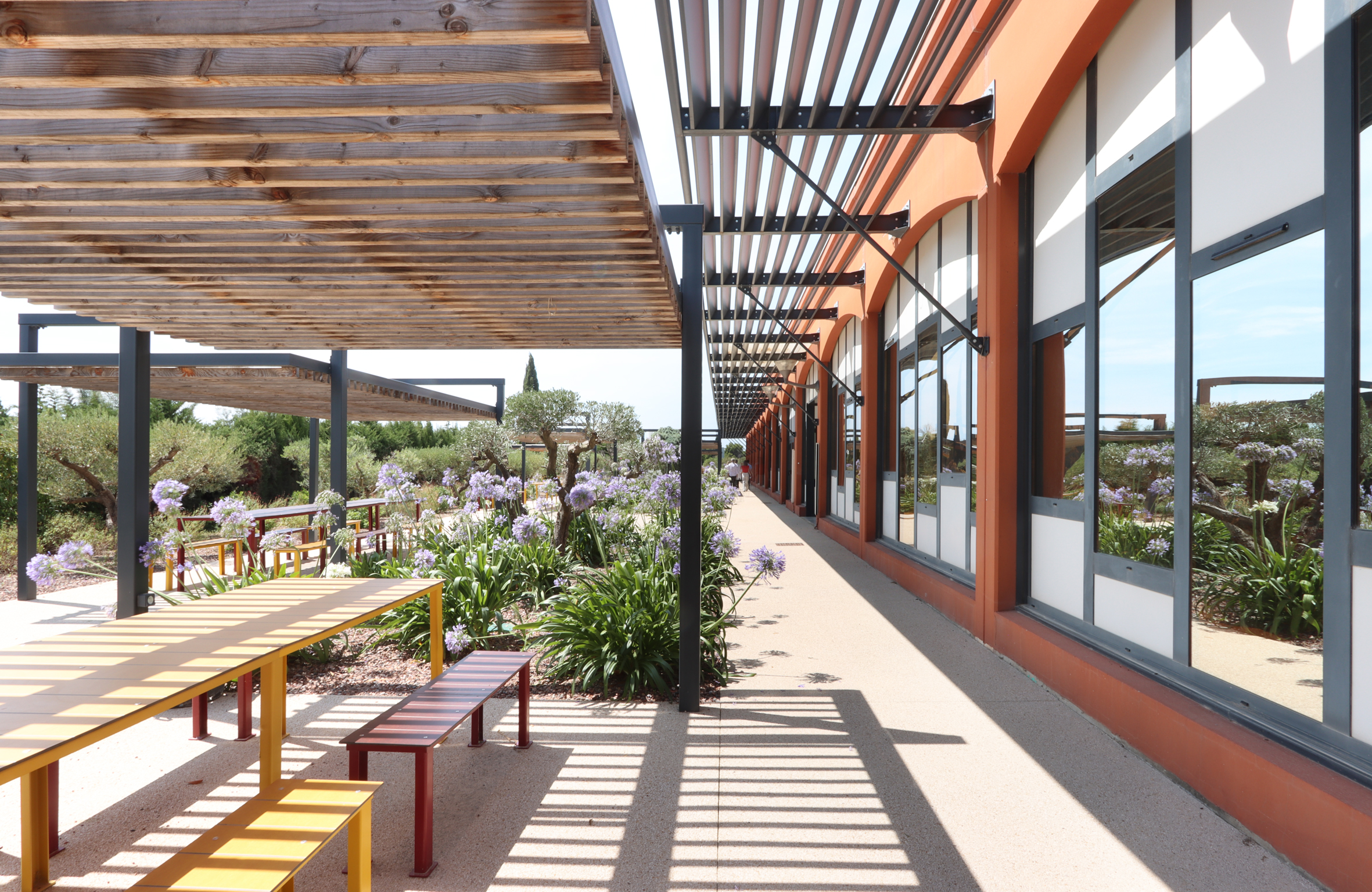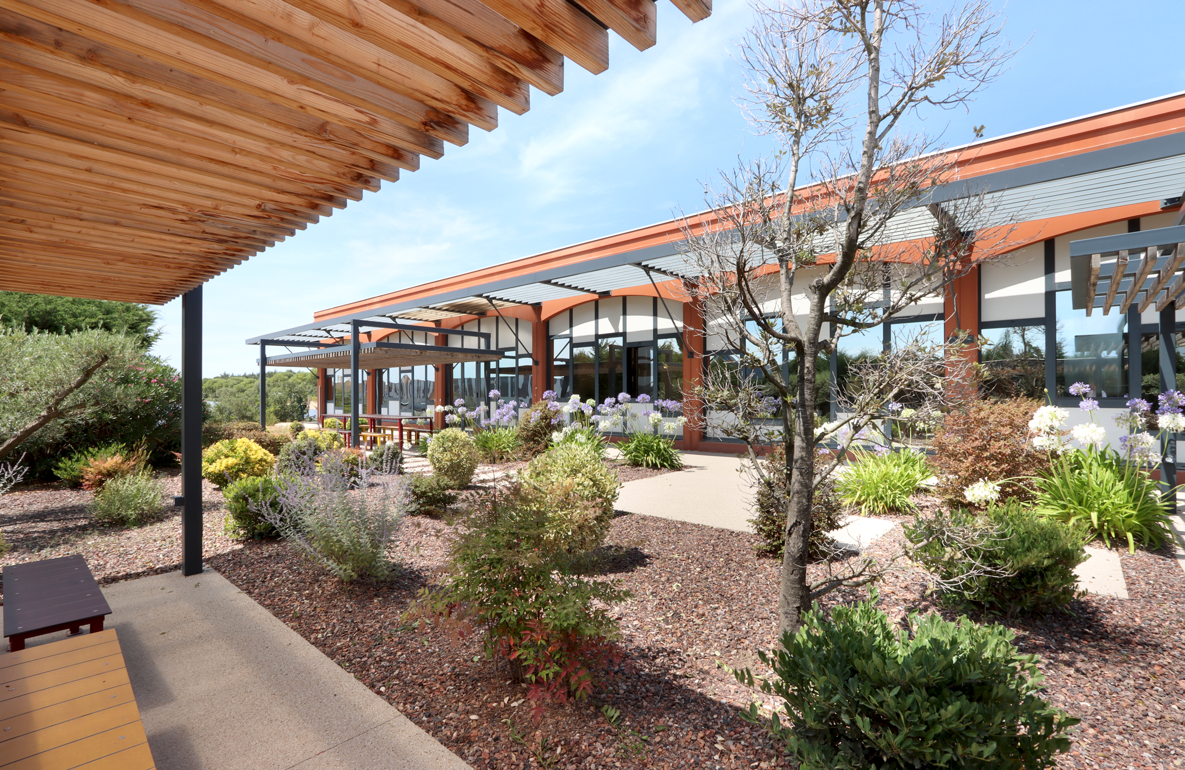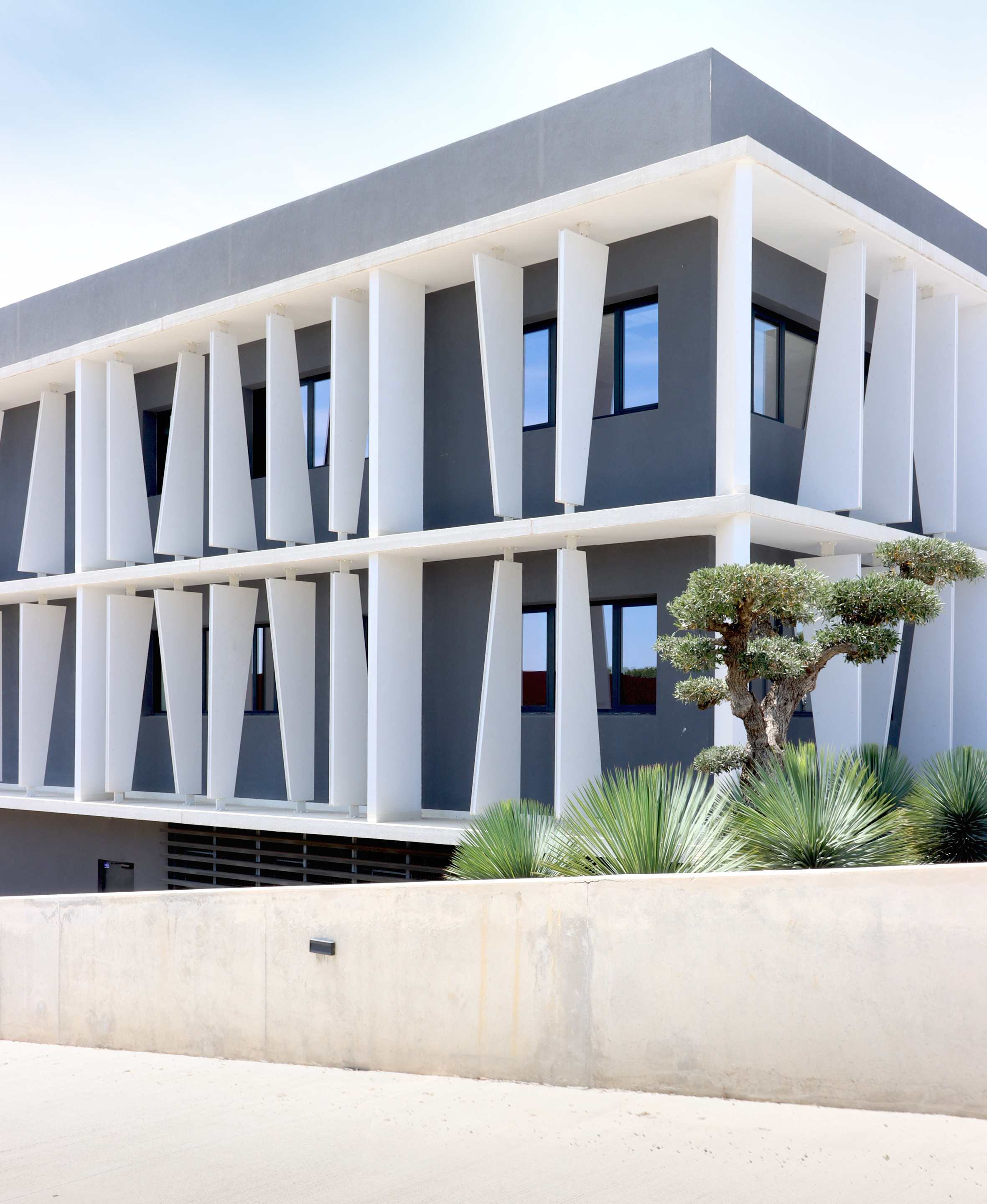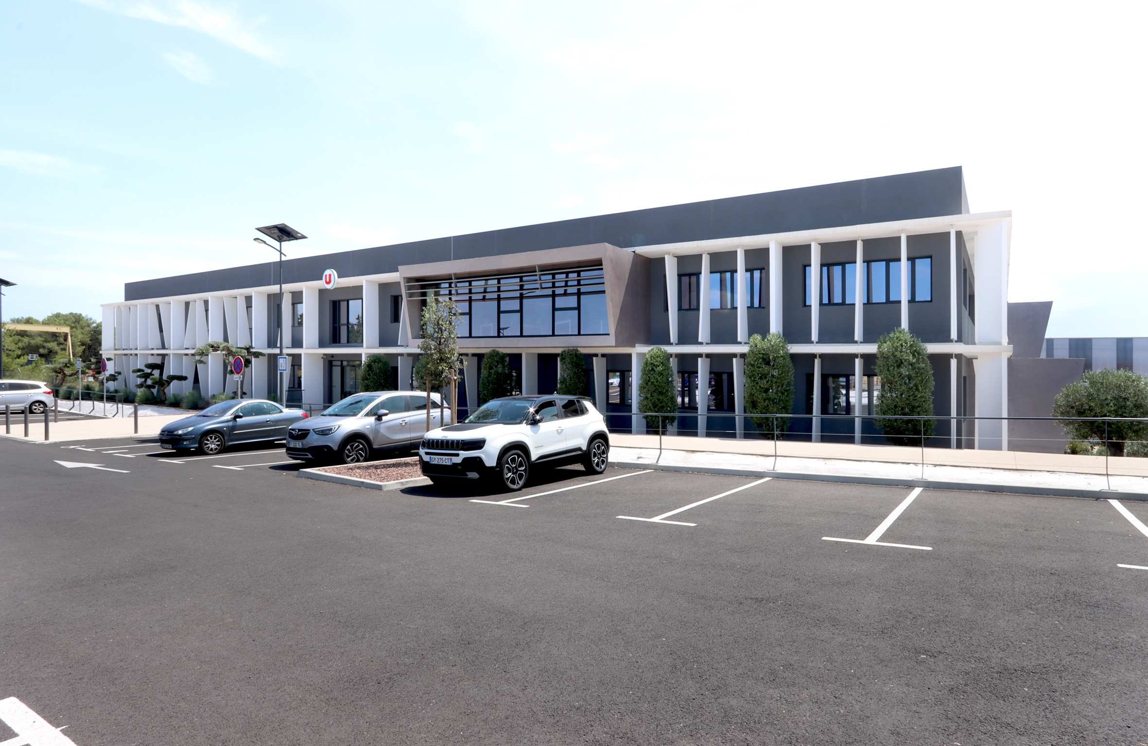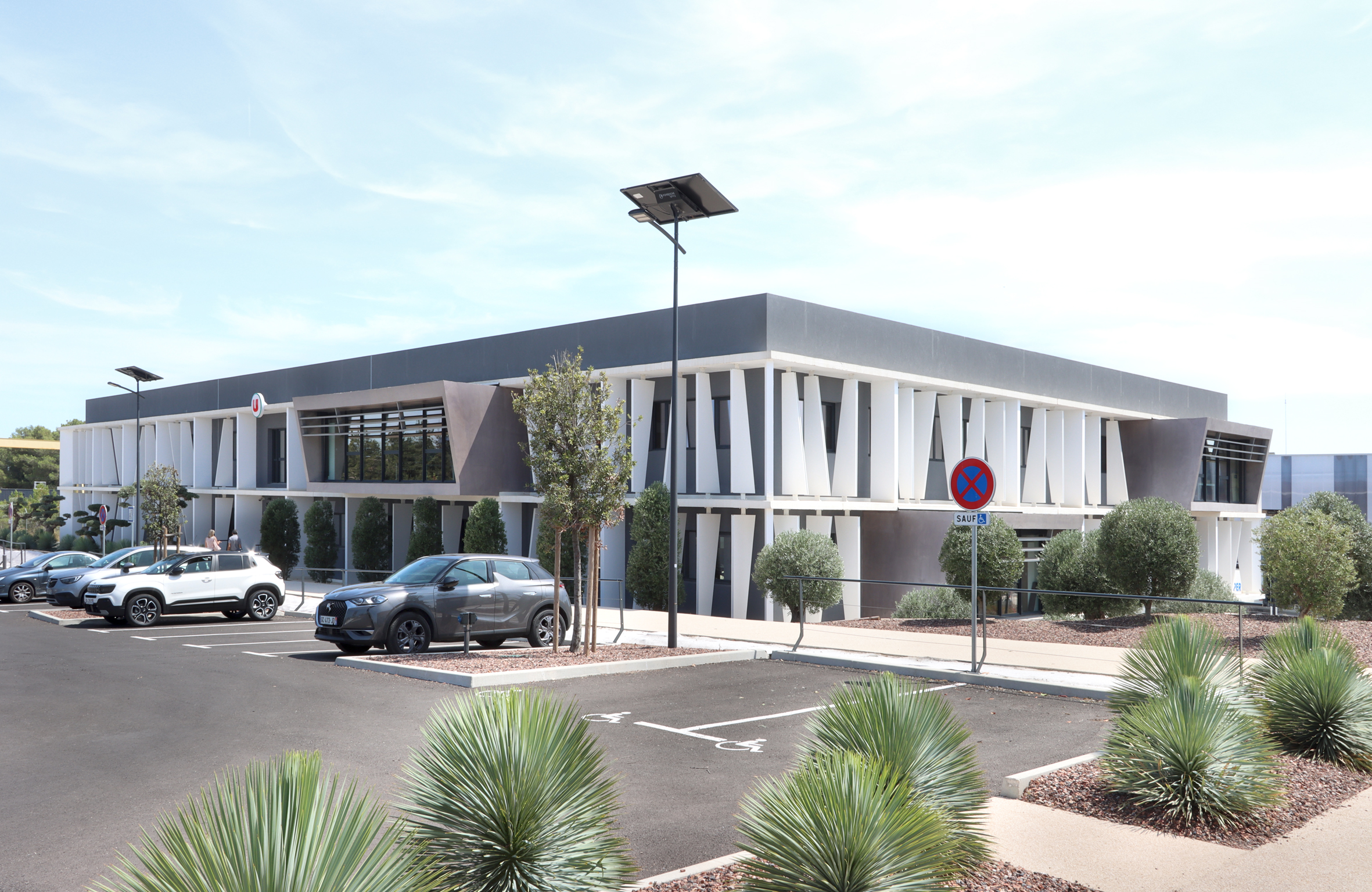 DESCRIPTION : Opération de création d’un immeuble de bureau entièrement en Flex office sur un site existant à la topographie prononcée. Utilisation du dénivelé pour la création d’un parc de stationnement semi enterré et y intégrer l’ensemble des équipements techniques. Volonté architecturale de travailler sur des strates matérialisées par les nez de planchers saillants et des volumes en porte à faux biseautés. Entre ces strates viennent se loger des protections solaires verticales qui trament le bâtiment. Ces brise-soleils verticaux ont une géométrie asymétrique et leur enchaînement anime la façade en suggérant un mouvement. La construction de ces brise-soleils est rationnalisée par l’utilisation d’un seul modèle géométrique, il est simplement retourné par rapport à ses axes pour proposer une variation dynamique afin de limiter l’utilisation de la matière. Deux Patios éclairent généreusement les espaces de travail. Ce sont des espaces extérieurs de détente. Traitement des aménagement extérieurs existants et création d’espaces de convivialité paysagés.