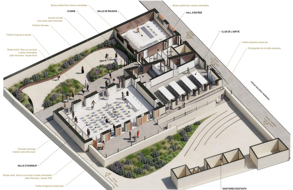 DESCRIPTION : Réaménagement de la salle d’honneur, salle de réunion et club de l’amitié du site Biscarat Bombanel avec traitements paysagés attenants.
