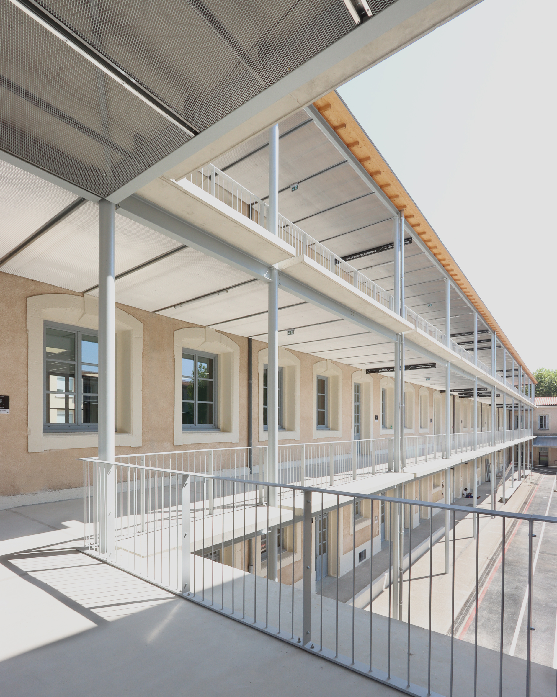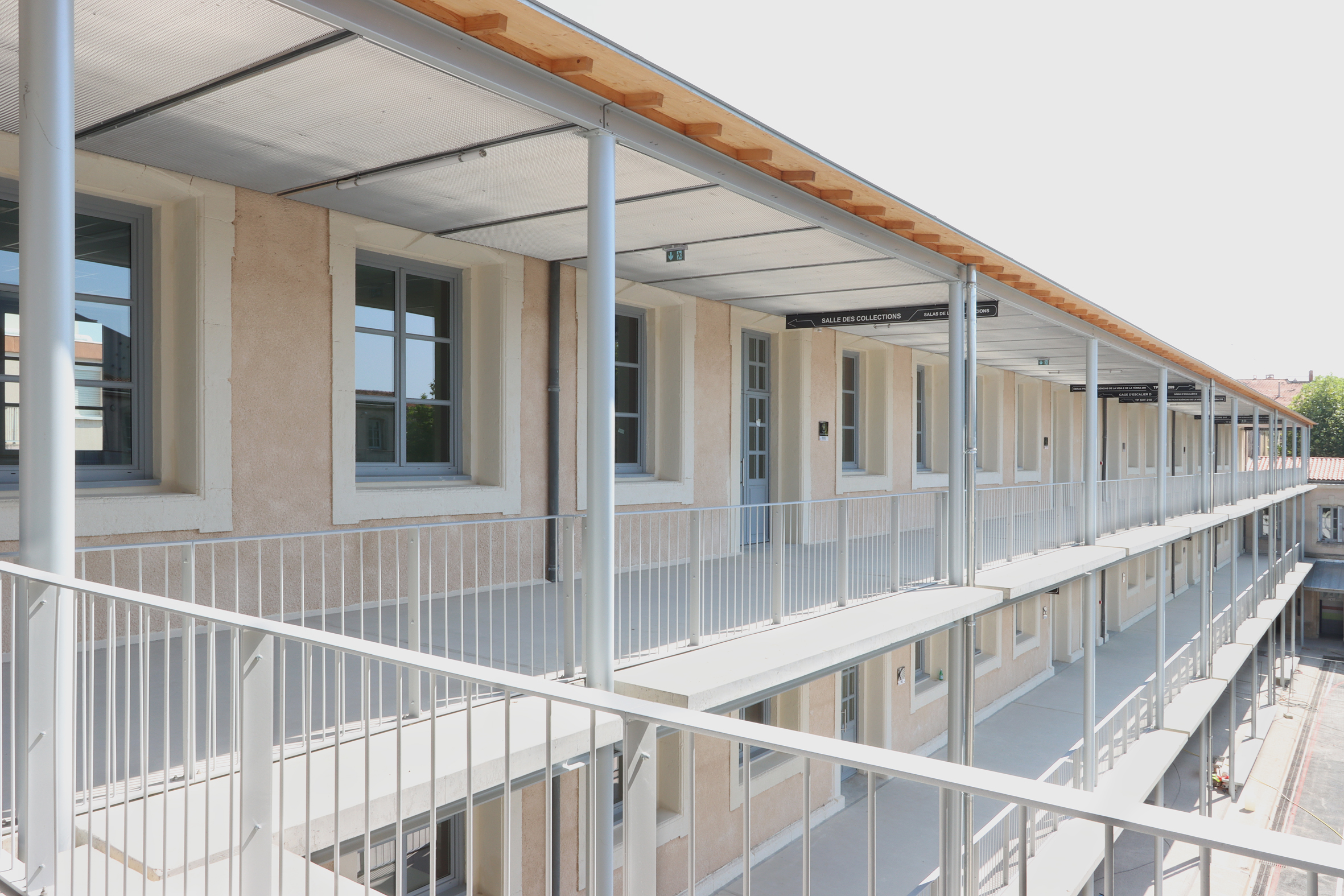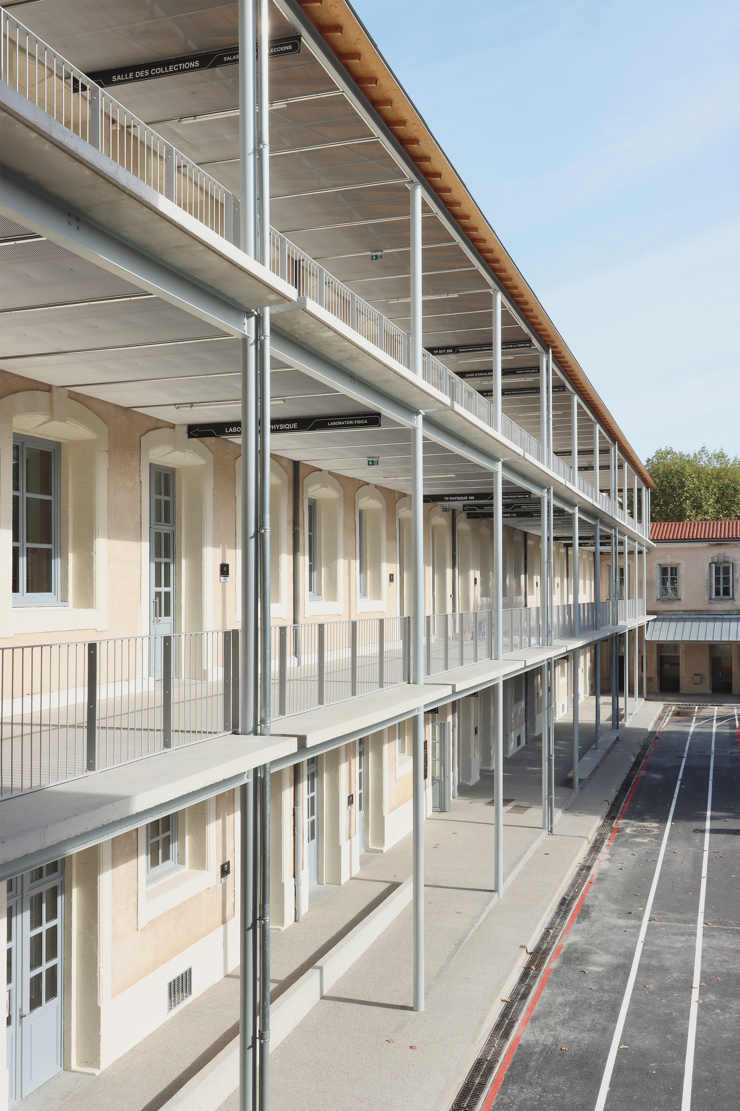 DESCRIPTION : Opération de réhabilitation en site occupé de la cité scolaire Georges Clemenceau avec restructuration lourde du pole sciences et technologique. Création de salles de musique et d’une salle de musculation. Construction d’une coursive extérieure permettant la mise en valeur patrimoniale de la modénature de façade existante. Rénovation énergétique et technique.