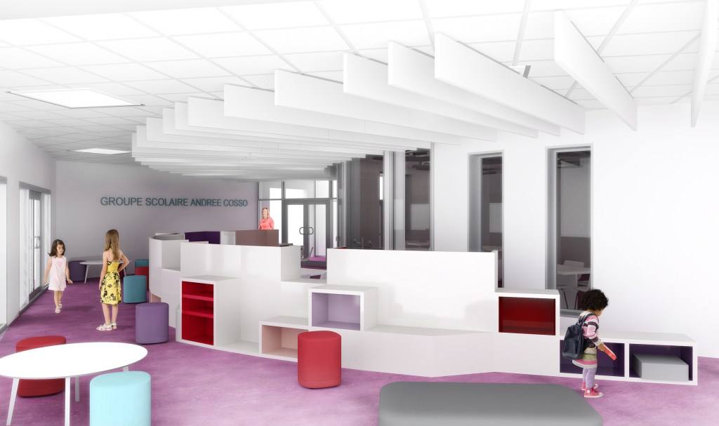 DESCRIPTION : Aménagement intérieur de l’espace partagé et du réfectoire du groupe scolaire Andrée Cosso de Vendargues. Mobilier intérieur polyvalent servant de bibliothèque, d’espace de jeux, de réfectoire et centre aéré.
