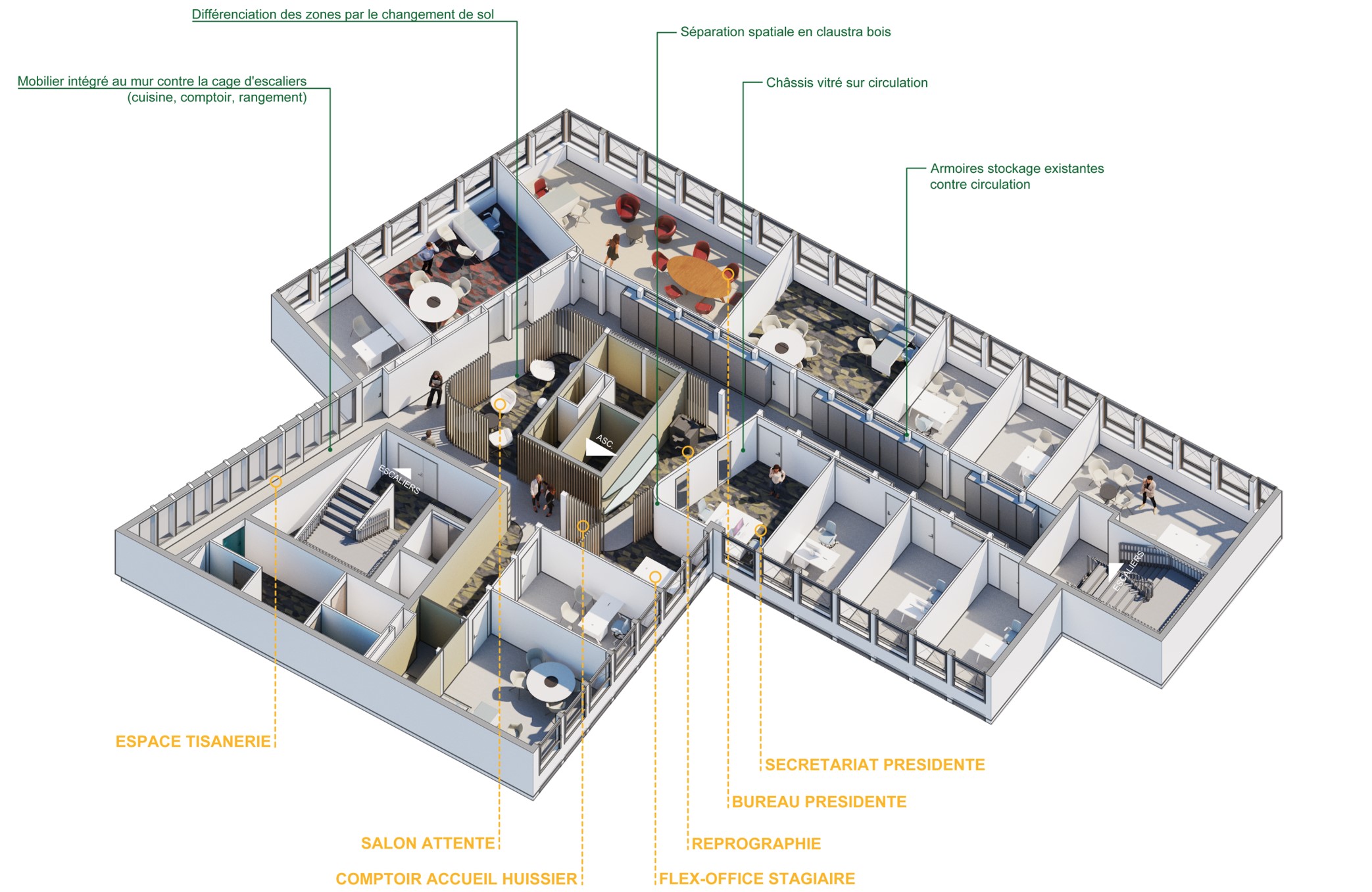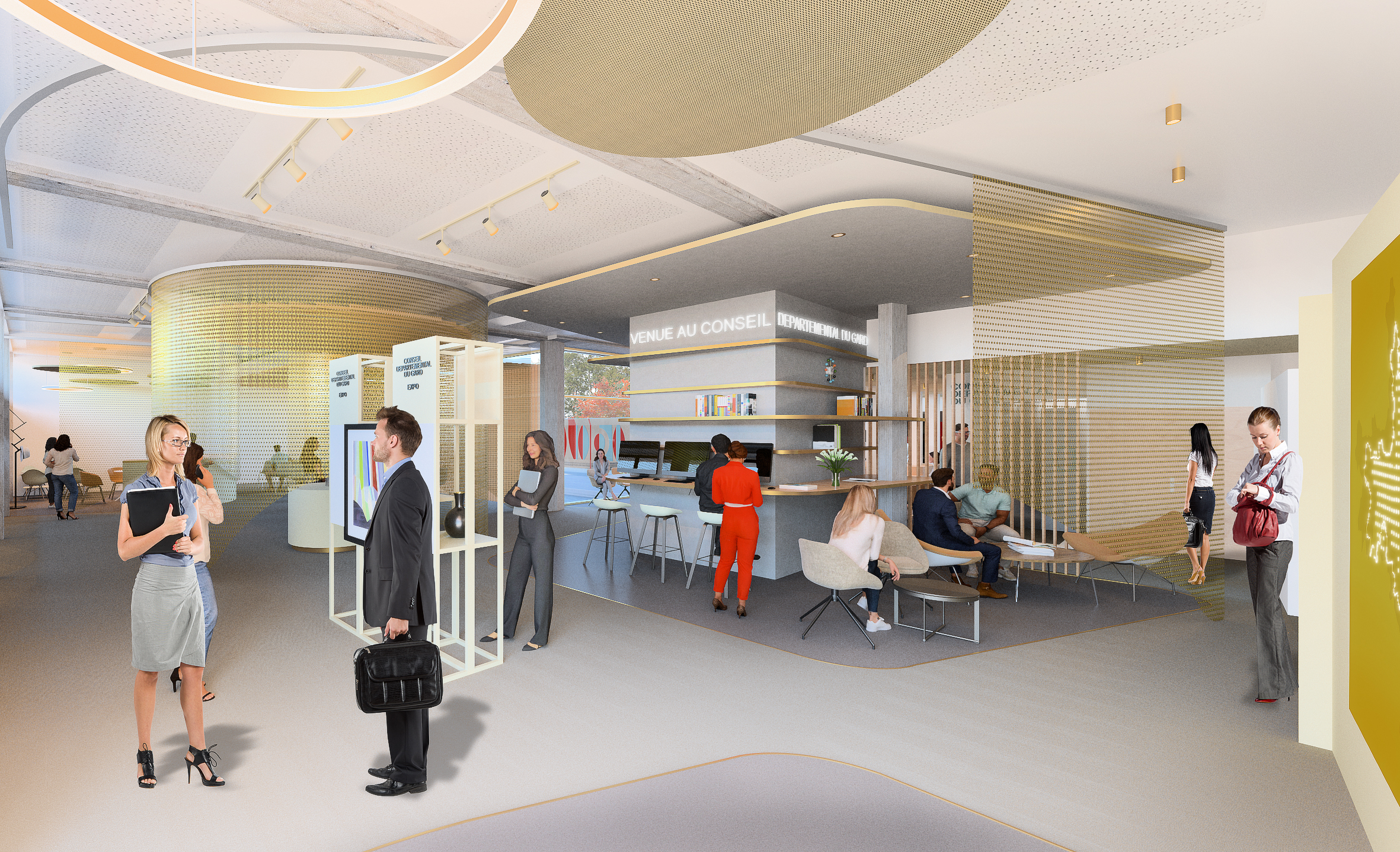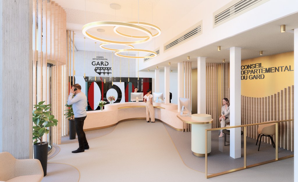 DESCRIPTION : Opération de rénovation intérieure et réaménagement des locaux de la maison du département à Nîmes. Bâtiment en R+7 comprenant des espaces d’accueil, espaces d’exposition modulables, espaces de travail partagés, salles de réunion et de formation, bureaux.